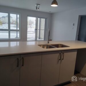 - Grande cuisine avec îlot central de quartz ouvert sur le salon