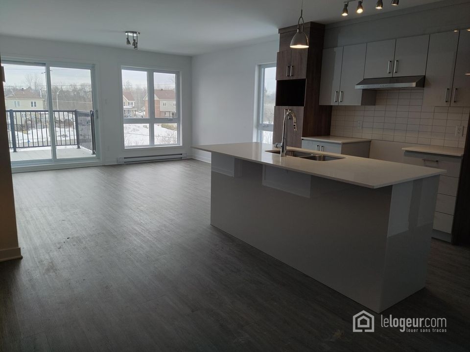 - Grande cuisine avec îlot central de quartz ouvert sur le salon