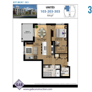 Unité: 203 Nombre de chambres: 1 Nombre de salles de bains: 1 Superficie: 934 pi2